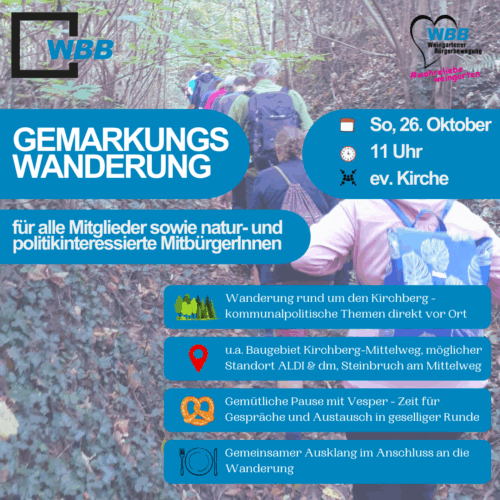 Die WBB lädt alle Mitglieder sowie interessierte Bürgerinnen und Bürger herzlich zu ihrer diesjährigen Mitgliederwanderung rund um den Kirchberg ein.